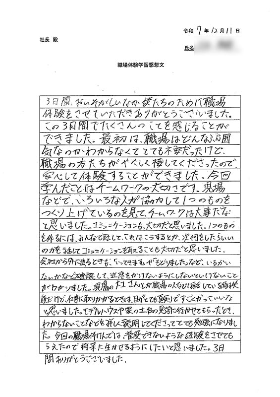 短い期間ではありましたが、今回の職場体験が、生徒さんたちにとって将来の進路や仕事について考えるきっかけになれば嬉しく思います。この経験を、ぜひこれからの学校生活や将来に役立ててください。
