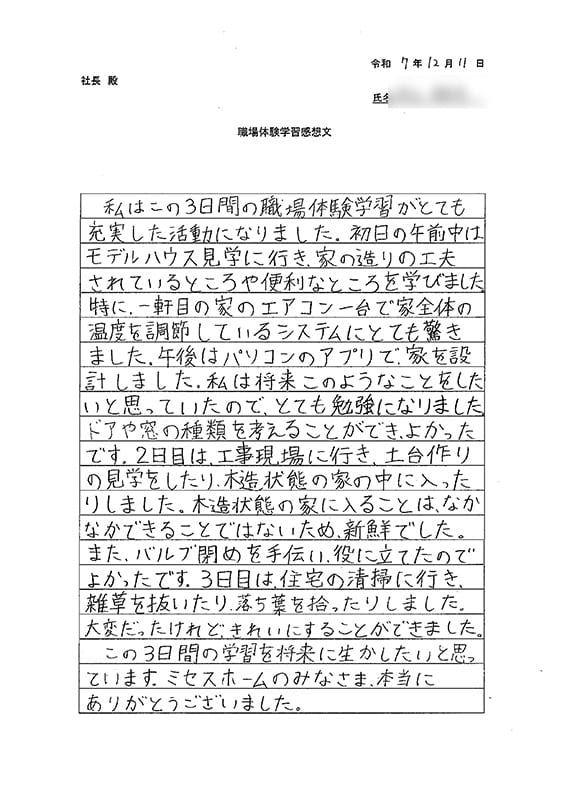 それぞれの感想から、3日間の体験を通して家づくりの仕事の幅広さや、人との関わりの大切さを感じ取ってくれたことが伝わってきました。