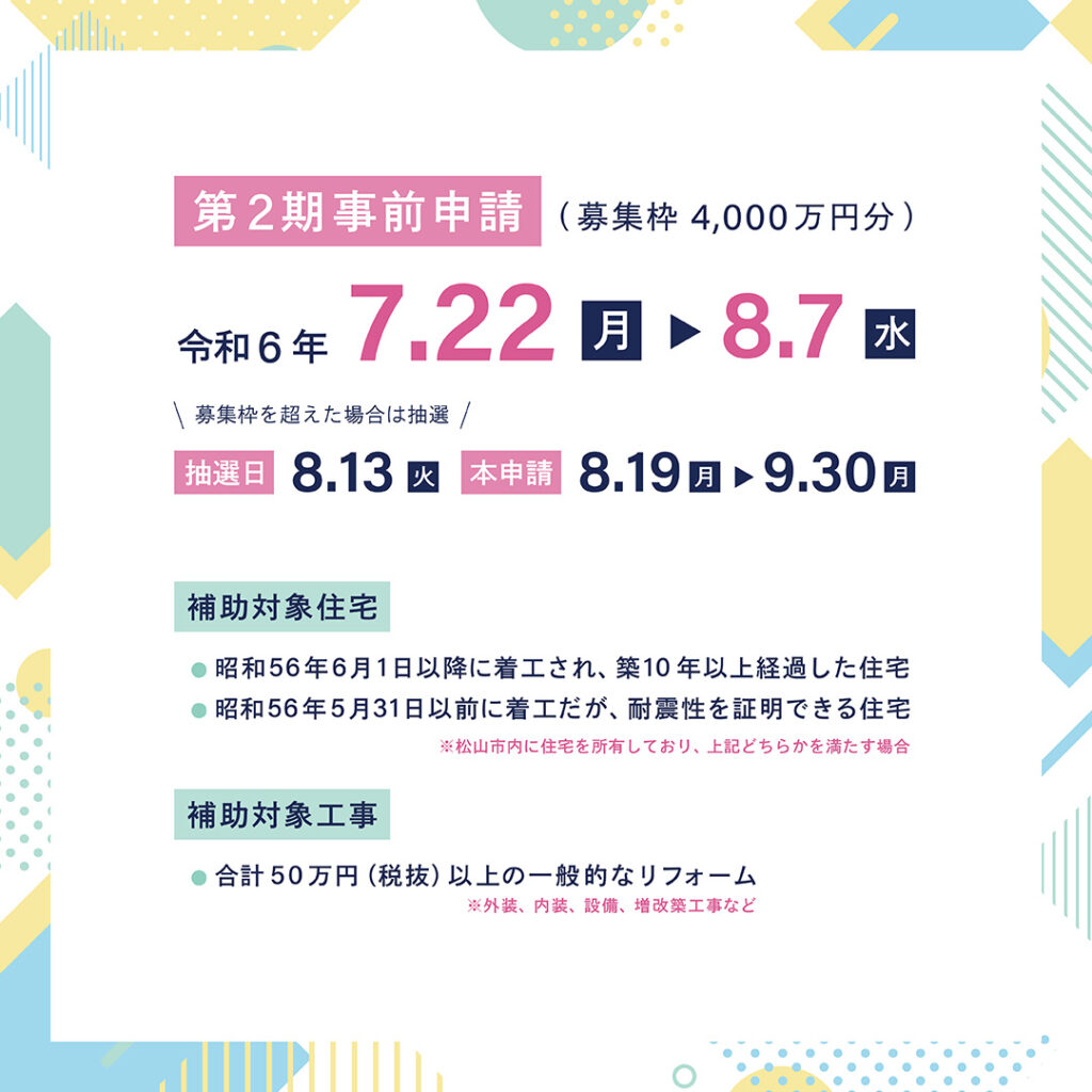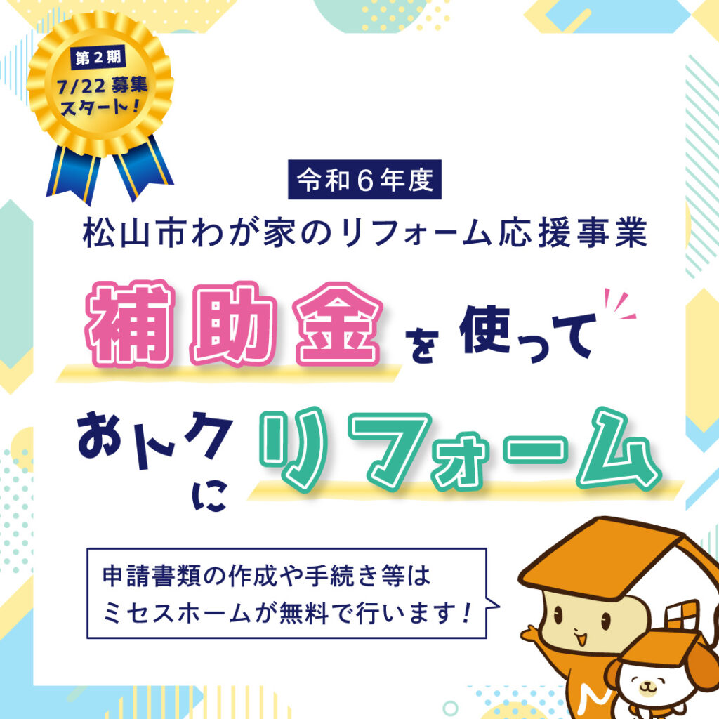 2024.7.22から松山市のリフォーム補助金の第2期募集が始まりました!工事費の10%(上限20万円)が補助金額となるお得な補助金です。応募多数の場合、抽選となりますが、この機会にお家の気になるところのリフォームを考えてみませんか?申請にあたり、補助対象となる工事見積書(コピー)が必要ですので、補助金の申請をしたい方はお早めにご連絡ください。お問合せお待ちしております。