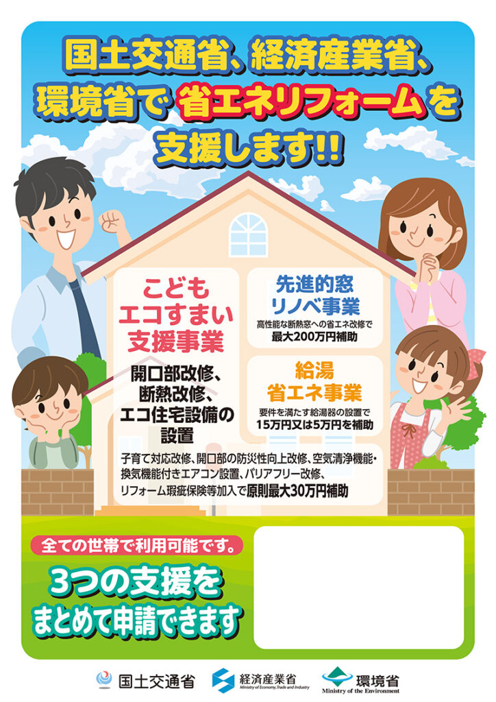 「住宅省エネ2023キャンペーン」とは国土交通省・経済産業省・環境省の3省連携による2050年カーボンニュートラルの実現に向けて住宅省エネ化を支援する新たに創設された3つの補助事業の総称です。