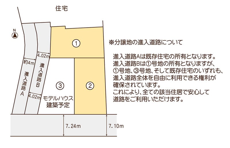 ○進入道路Aは既存住宅所有、進入道路Bは1号地所有ですが、1号地・3号地・既存住宅の全てが自由に利用できる権利が確保されています。
