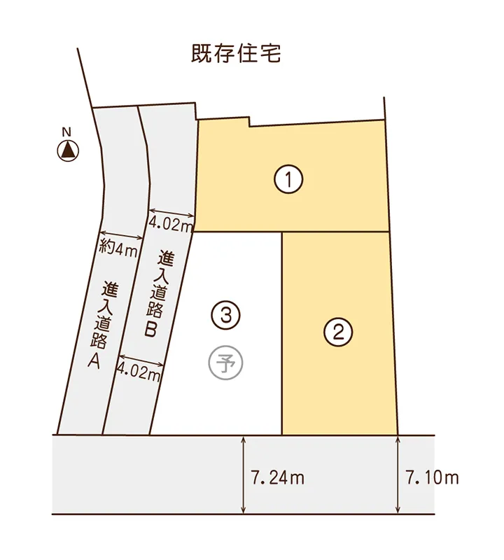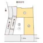 | 備考 | ○上水道負担金 1区画30万円 ○旧既存宅地 ○建築条件付 ○進入道路Aは既存住宅所有、進入道路Bは1号地所有ですが、1号地・3号地・既存住宅の全てが自由に利用できる権利が確保されています。 ※建築条件付き宅地とは土地売買契約を3ヶ月以内にミセスホーム株式会社と住宅の建築請負契約を締結していただくことを条件として販売いたします。この期間内に建築請負契約が成立しない場合、土地売買契約は白紙となり受領した土地代金・手付金などはすべて返還いたします。 |