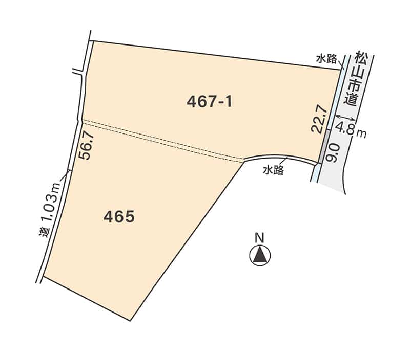 | 道路 | ・東側:松山市道 幅員 4.8m、接道接面:22.7m ・西側:1.03m(建築基準法上の道路ではない)、接道接面:56.7m |