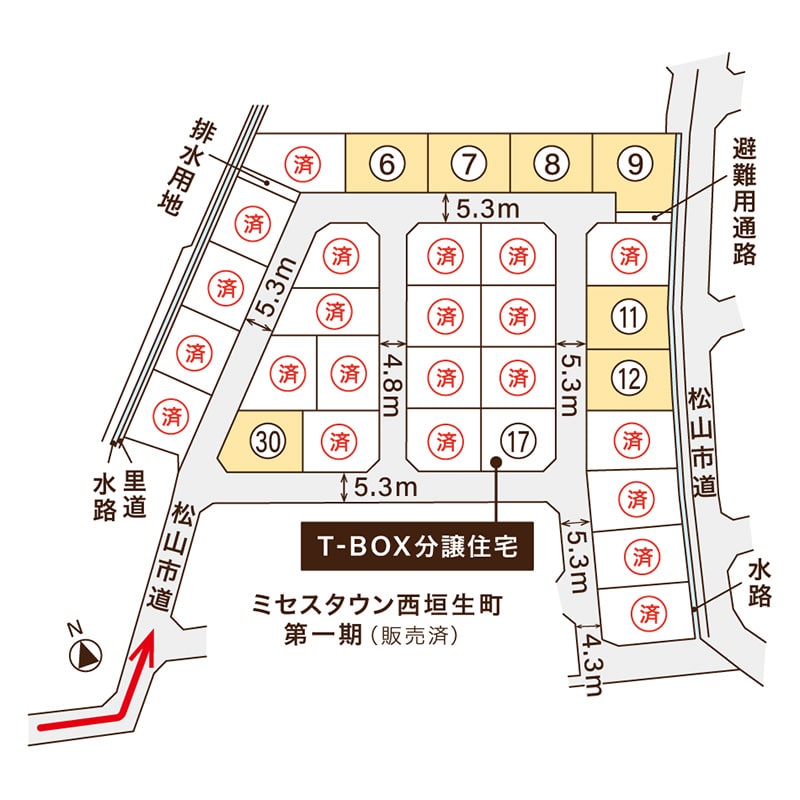 道路団地内:4.8m、5.3m 開発道路(市道に編入)