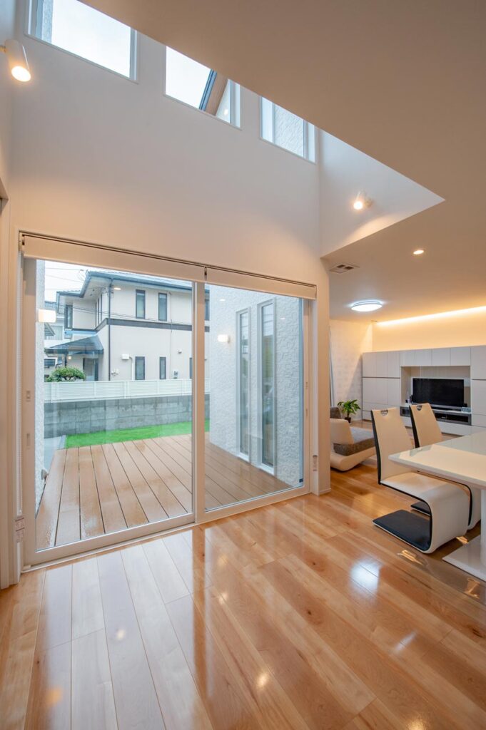 LDKから続くウッドデッキと中庭は3人のお子様がのびのび健やかにすごせるように工夫を重ねた間取り。