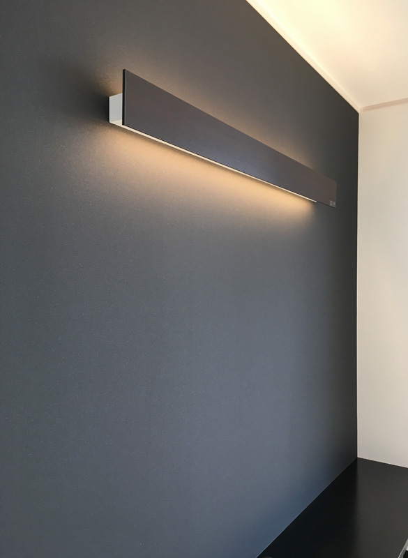 造作のTVボードの上部には間接照明を入れた。